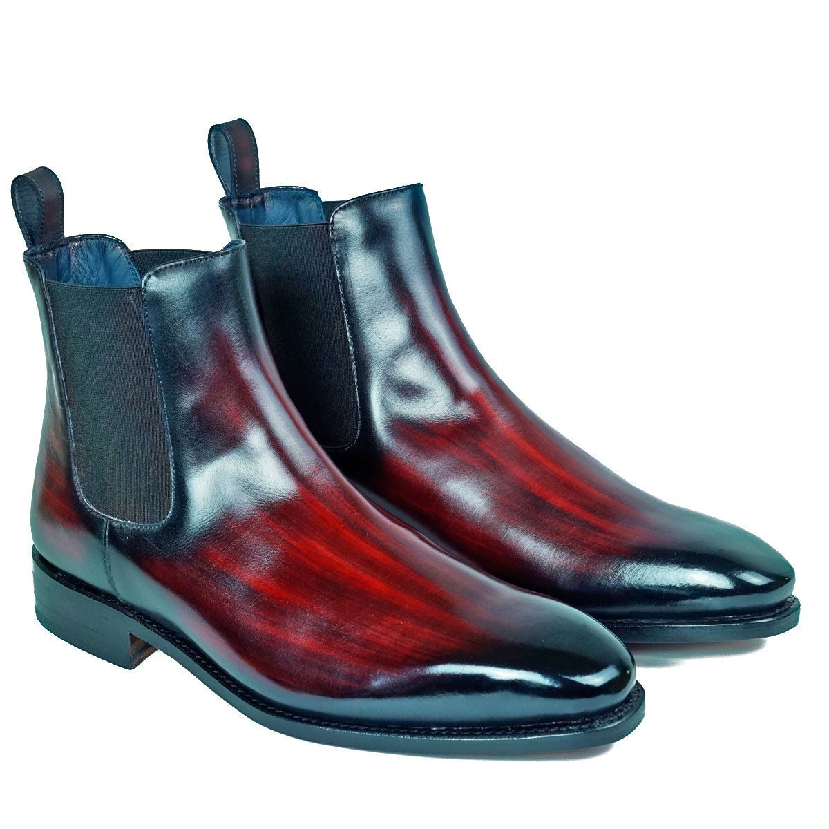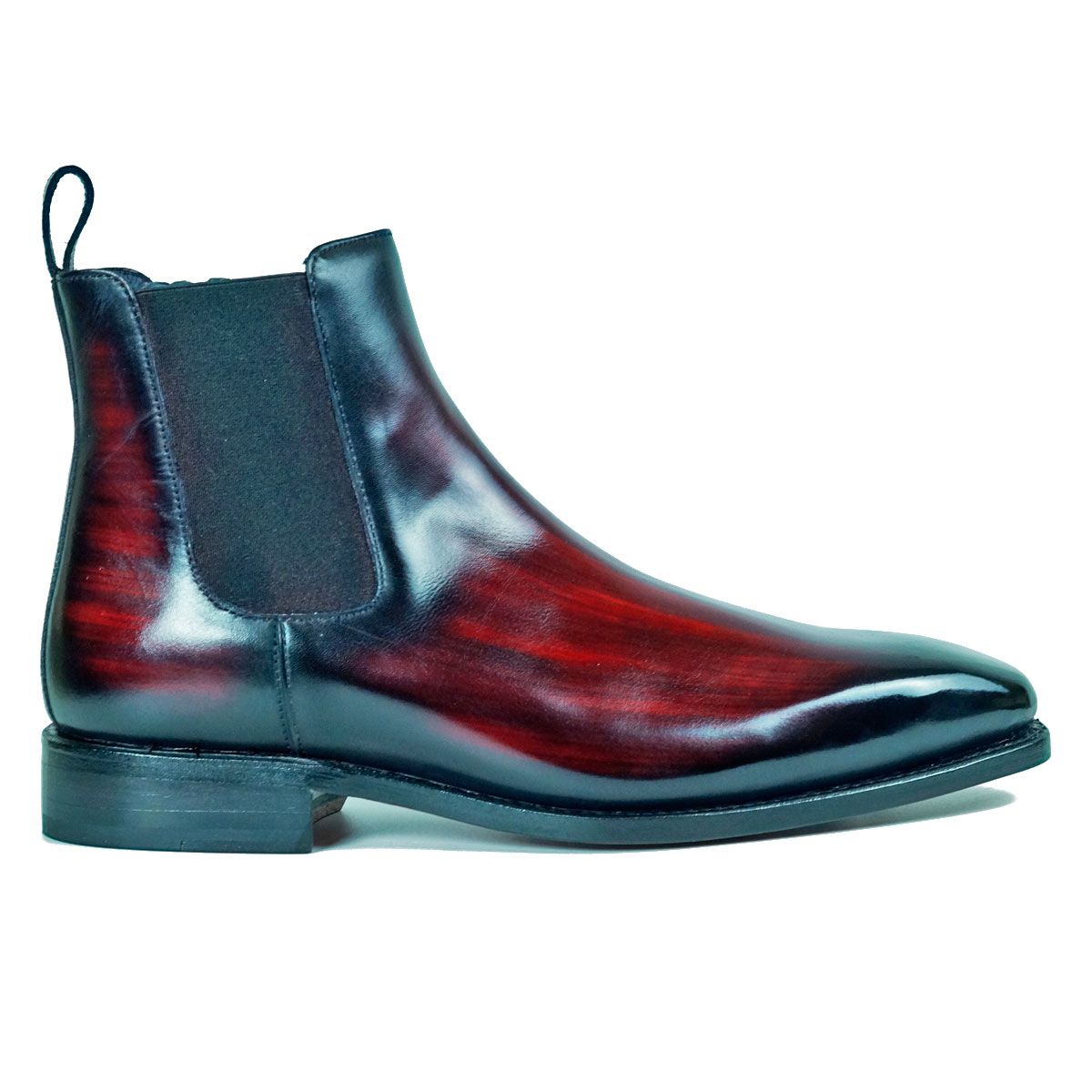 The style Estany Wine is a Chelsea boot hand-painted in different shades of wine color.
